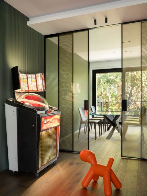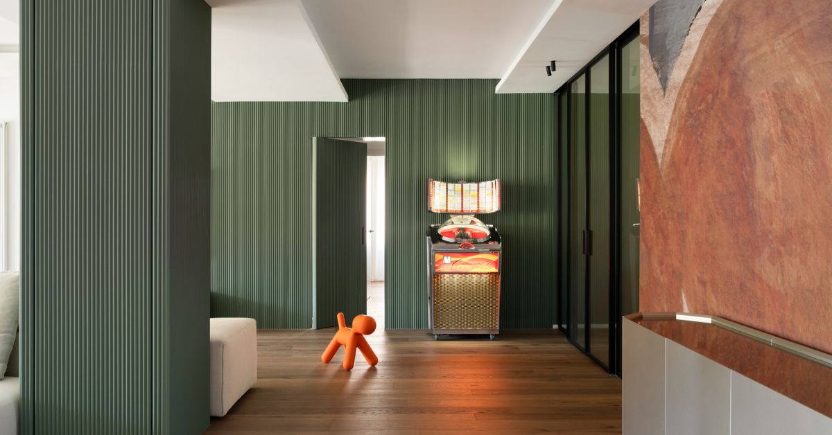 Tra elementi iconici come un jukebox Ami Continental del 1962 e arredi che evocano le avventure spaziali del Novecento, l’abitazione unisce memoria e futuro, materia e immaginazione.